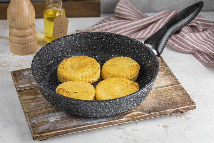 - Melt the remaining butter in a frying-pan, and fry the polenta until golden brown on both sides.
