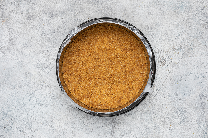 - Форму накройте фольгой. Поставьте чизкейк в духовку. На дно духовки поставьте сковороду без ручки или любую кулинарную форму с горячей водой. Выпекайте чизкейк около 1 часа 15 мин., края должны схватиться, а середина слегка подрагивать. По истечении срока выключите духовку и не открывая дверцы оставьте чизкейк на несколько часов, а затем полностью остудите при комнатной температуре. Подержите в холодильнике несколько часов, украсьте и подавайте к столу.