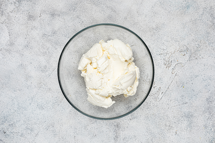 - Сливочный сыр, жирные сливки, сахар, ванильный сахар, яйца и кукурузный крахмал положите в глубокую форму и пробейте погружным блендером до достижения однородной массы.
