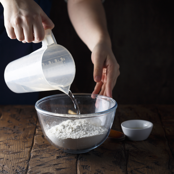 - Муку смешать с солью. Постепенно влить воду и растительное масло. Замесить мягкое, но не слишком липкое тесто. Накрыть и оставить на 15 минут.